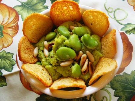 Per la presentazione del piatto porre il paté ( eventualmente aggiungere ancora un poco di olio per renderlo più cremoso) in ciotoline e decorare con alcune fave e i pinoli tostati ....